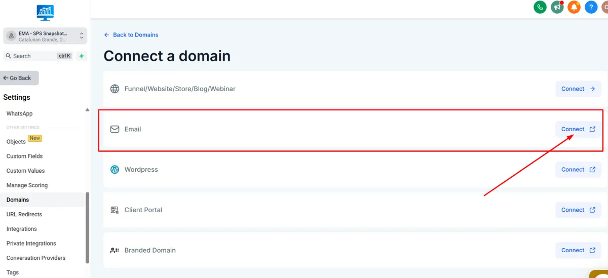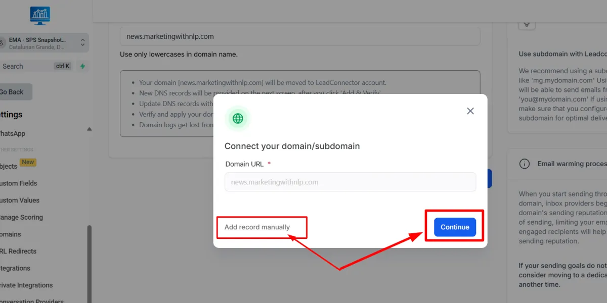 A pop-up box will open. If you're using GoDaddy or CloudFlare as your domain provider, you can click on "Continue". You'd be prompted to log in and connect "Lead Connector" (which is our CRM's name on the backend). Just click on the continue button until you get to the success page.