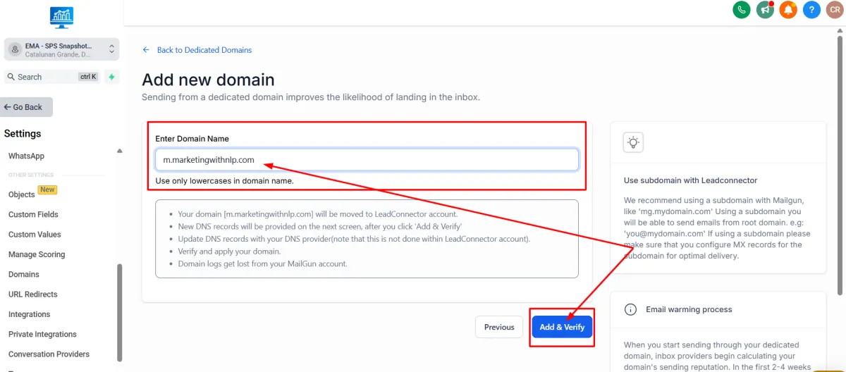 Enter your chosen subdomain name in the box that says "Add new domain". After that click on the button the says "Add & Verify".