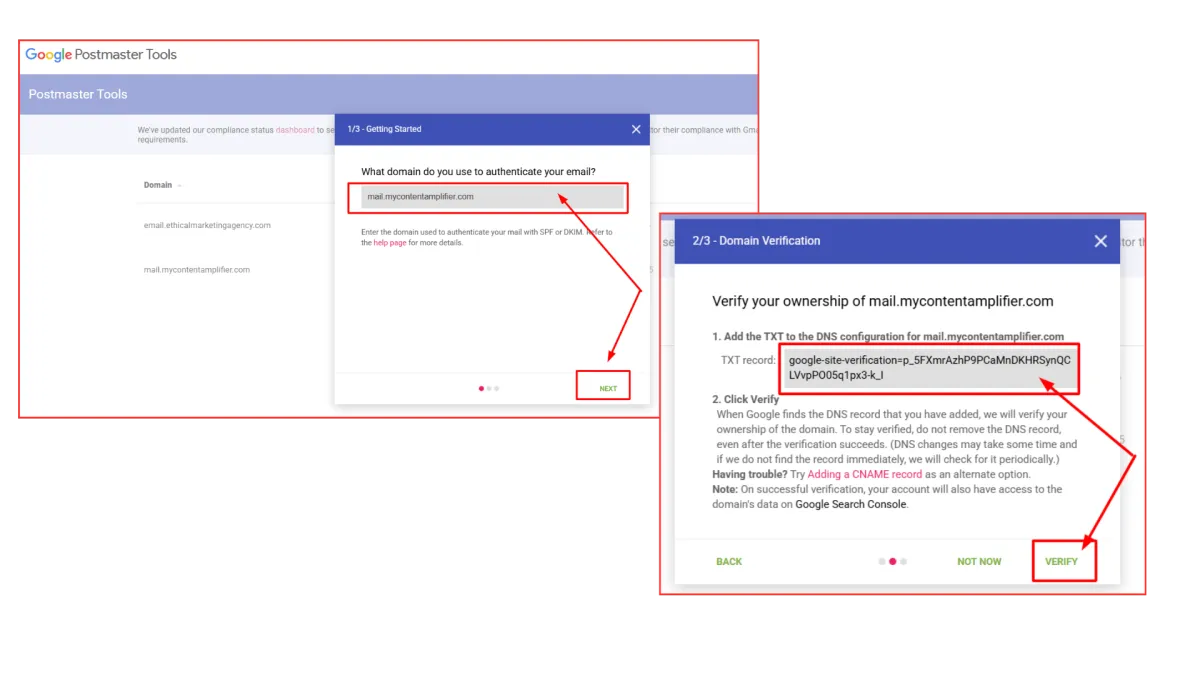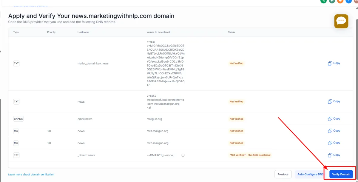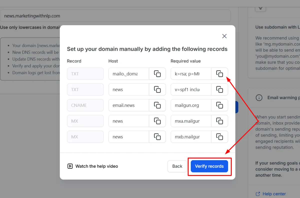 As soon as you've clicked that button, a new pop-up box will open. From the box, you have to copy and paste the DNS records to your Domain Provider.