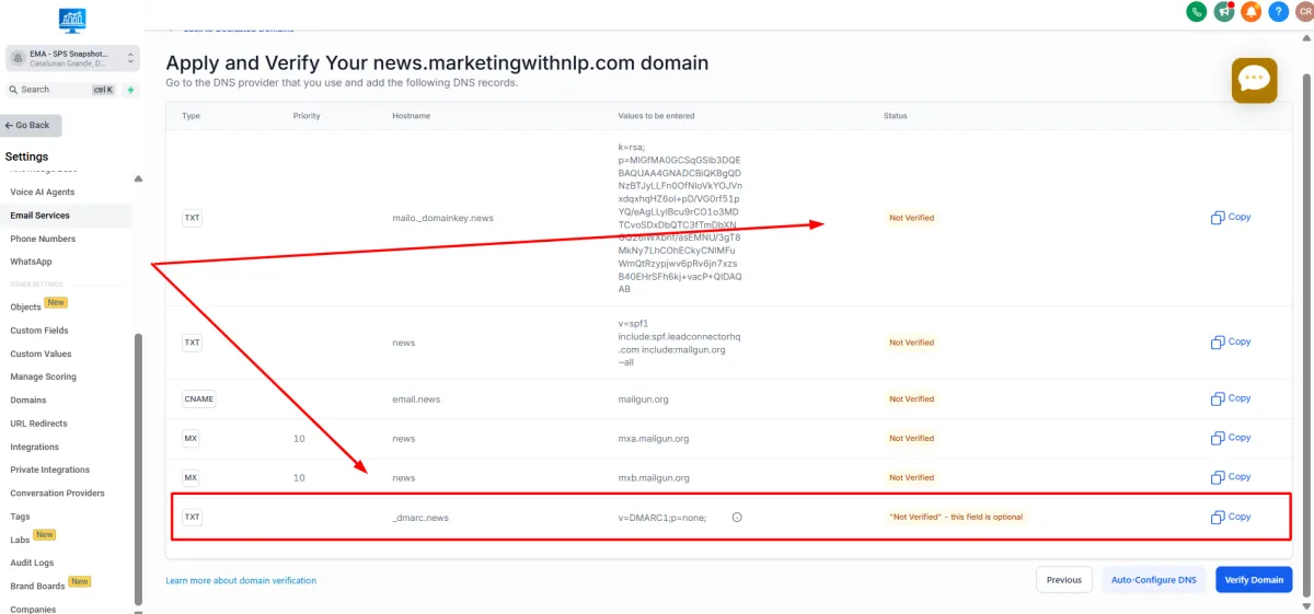 3. Verify your domain. As soon as you're done adding all records, click on the "Verify records" button and it will take you to the Email Services page. You'll see that the records you have recently added will say "Not Verified". Moreover, there's a new record to add at the bottom of the page called "_dmarc".