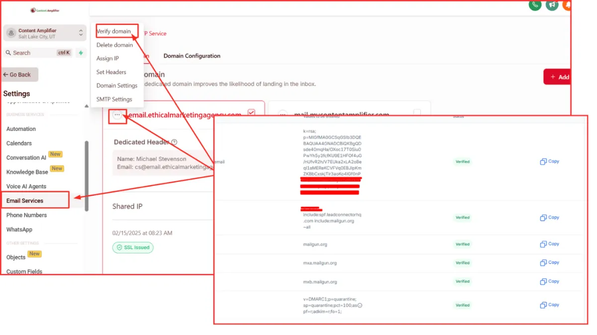 If you need to go back to this screen later on, go to Settings > Email Services > Dedicated Domain and IP and then choose your domain from the list. Click on the 3 dots and choose "Verify domain".