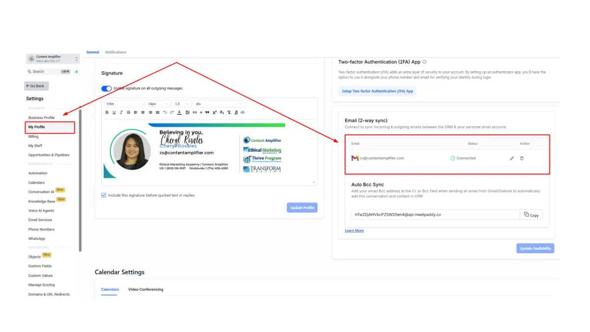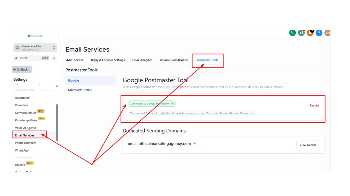 With the subdomain you’ve set up (e.g. mail.contentamplifier.com), the CRM can already send emails on your behalf. If someone replies to one of those emails, their reply will show up right inside the CRM under that contact. You don’t need Gmail or Outlook for that part.