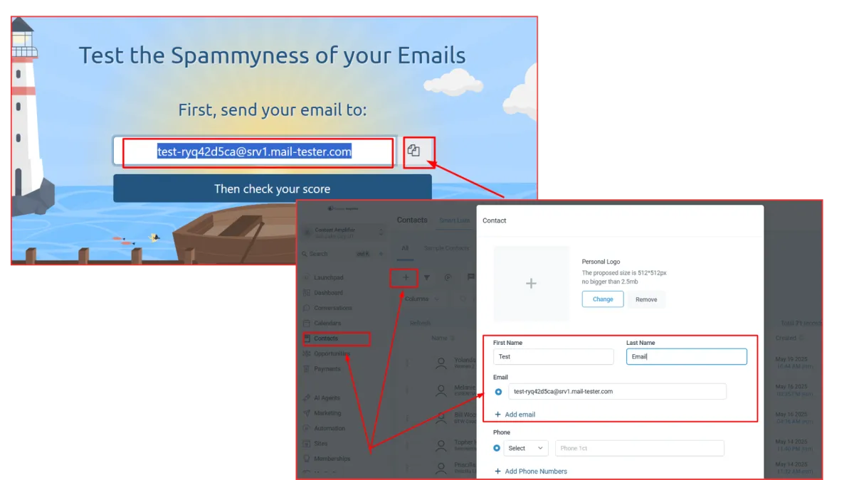 Add this test email as a new contact in your PandaDash or GHL subaccount. Go to Contact, click on the + button on the upper left side of the main view. Enter a test first and last name and then paste the email you just copied. Click "Save".