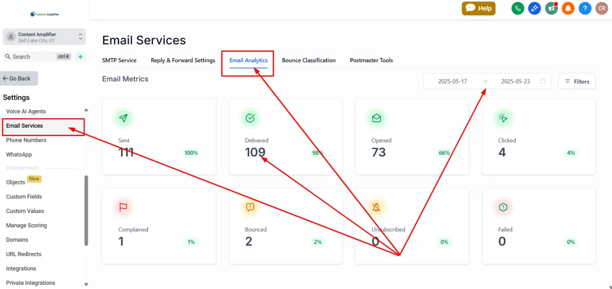 You can monitor your email statistics right within the CRM, go to Settings > Email Services > Email Analytics.