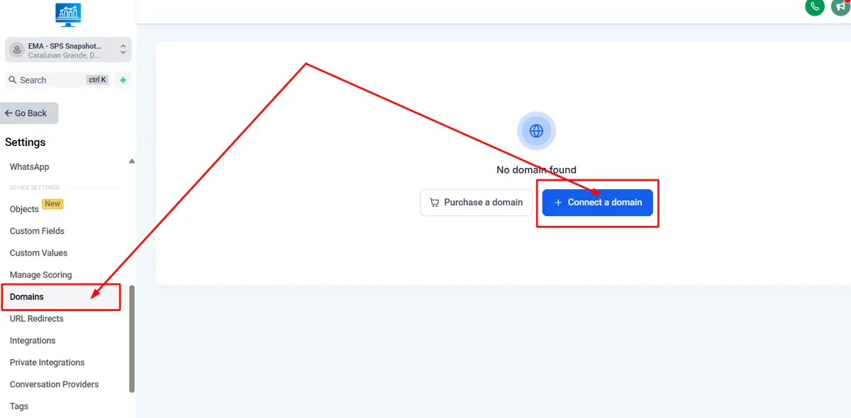 Once you have decided on your subdomain name, you can start the integration. Go to Settings > Domains > Connect a domain